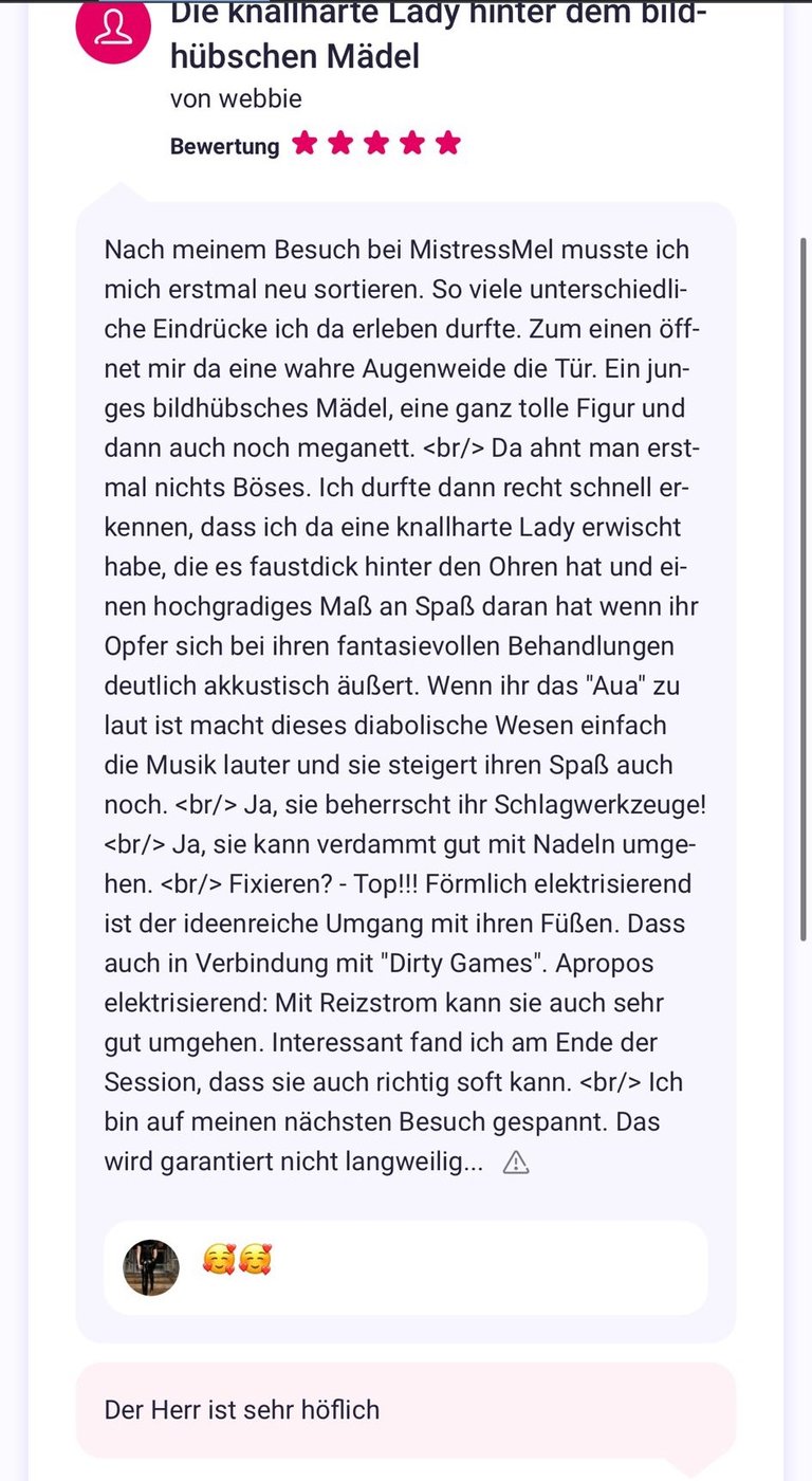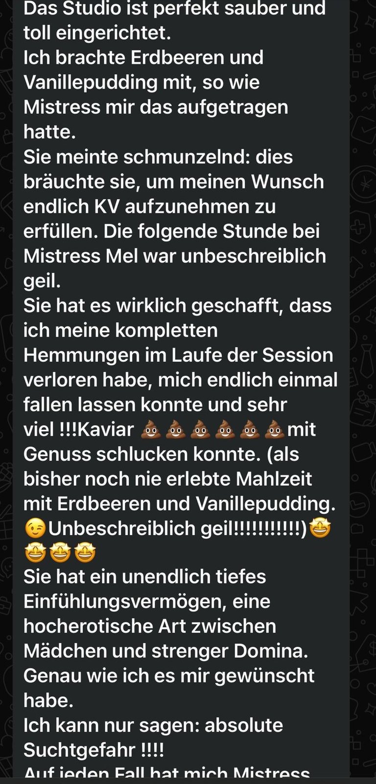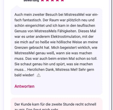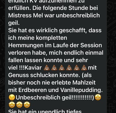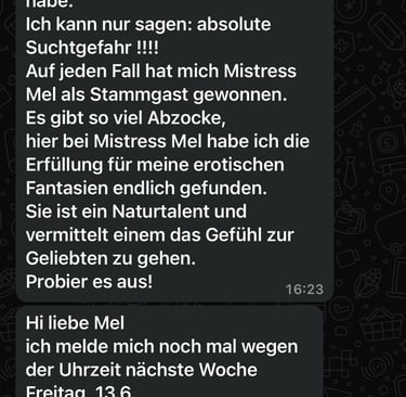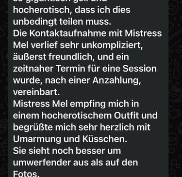 Mistress Mel's sessions leave a lasting impact, and her loyal followers have much to say about their experiences. Read through the testimonials of those who have dared to submit and have been rewarded with the unforgettable. Discover why Mistress Mel is a trusted and revered name in the world of domination and fetish.